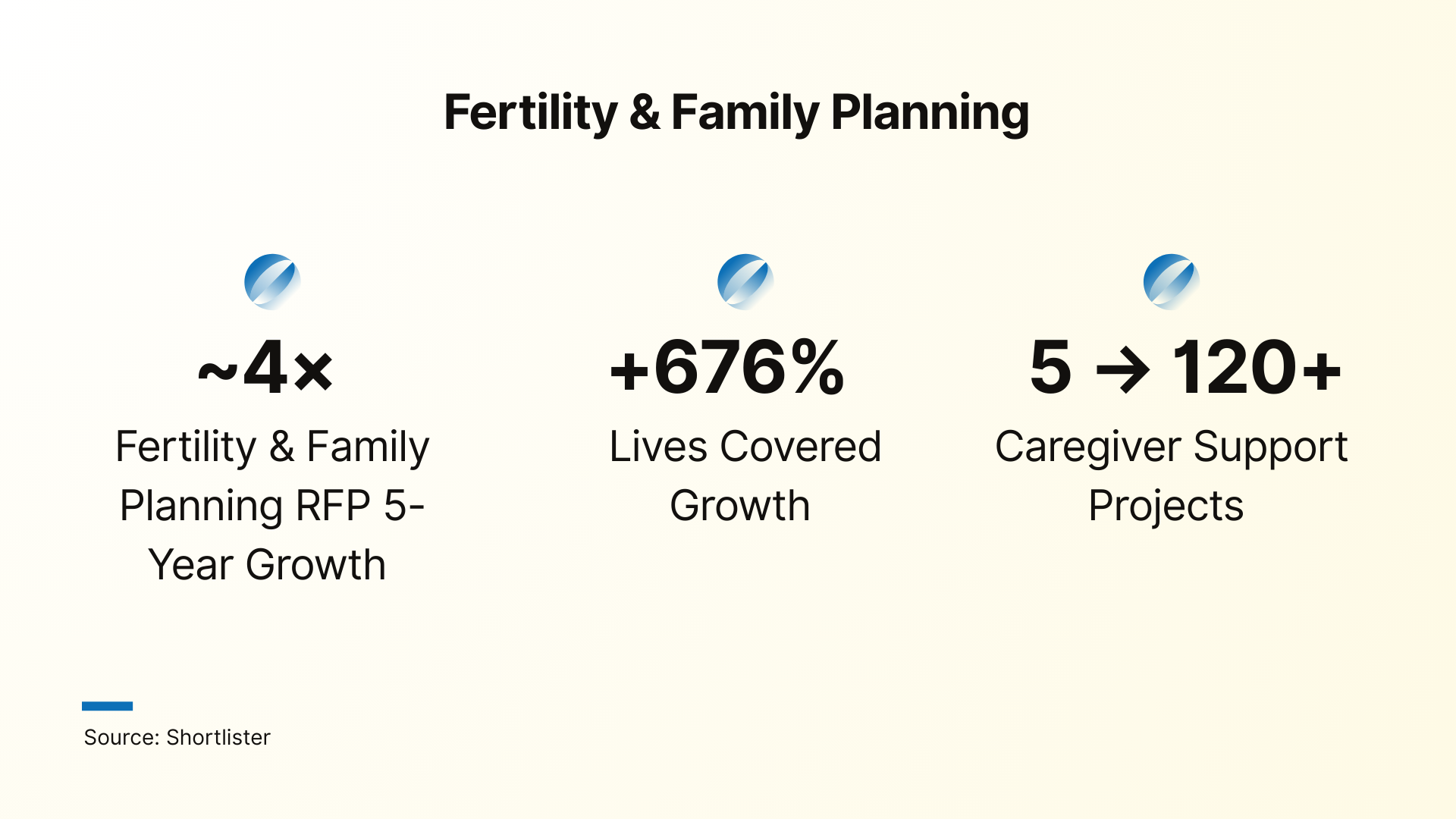 Fertility and family planning programs have evolved from a non-existent presence to one of the fastest-growing benefit categories. Project volume grew roughly four to five times between 2020 and 2025, and this growth translated into a significantly larger share of covered lives.
