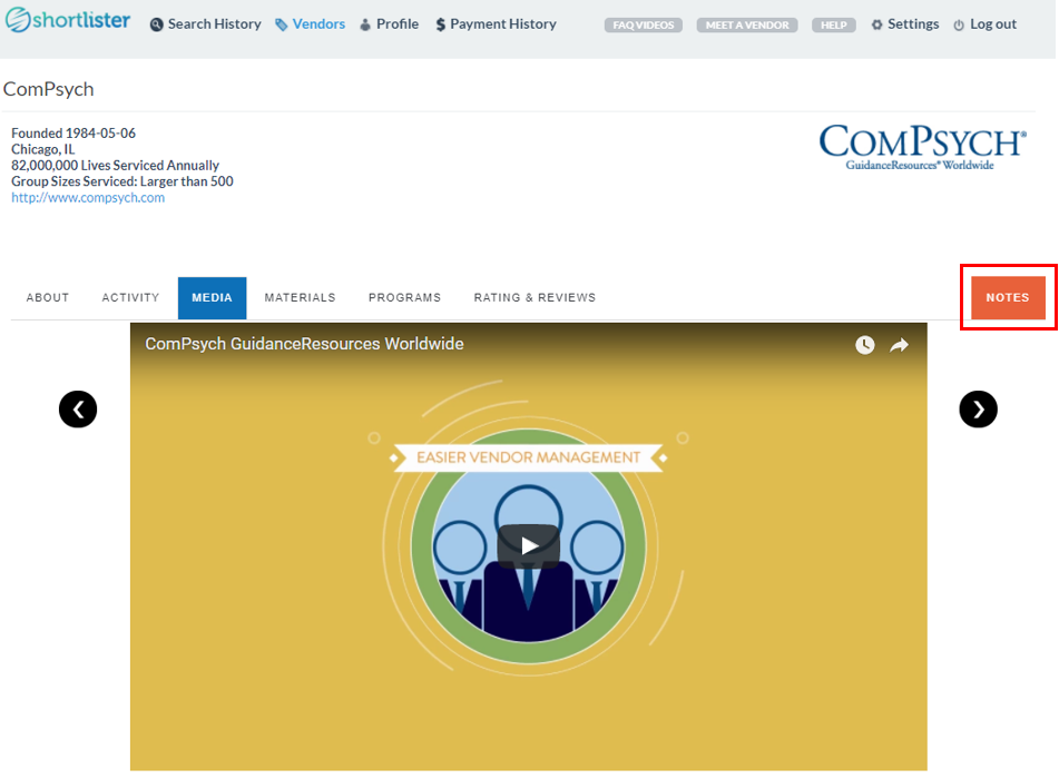 3. You can also click on a vendor name and go straight to their profile. Once there, you can click on “Notes” and view all of the notes posted by your team for this vendor: