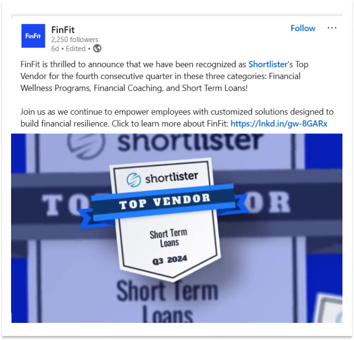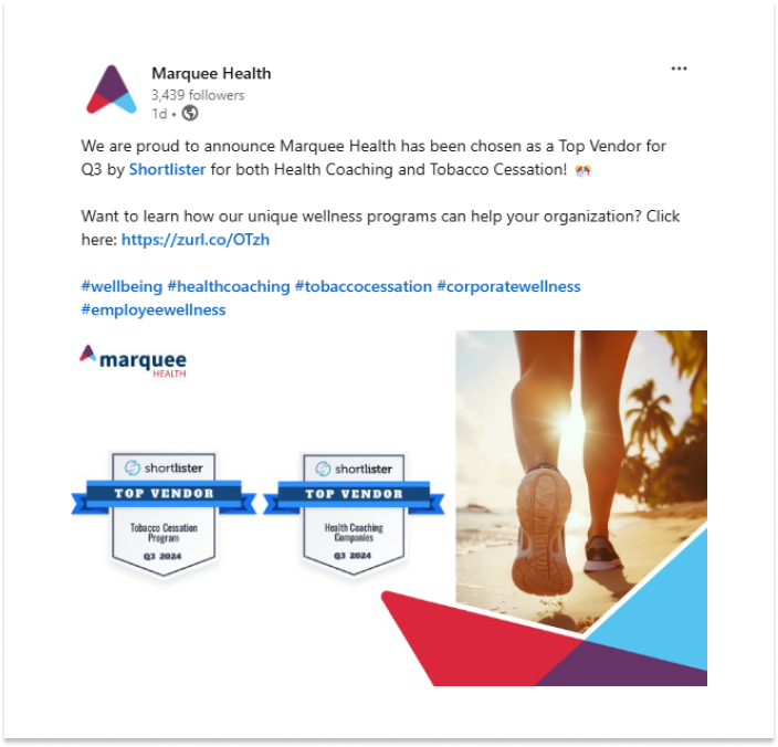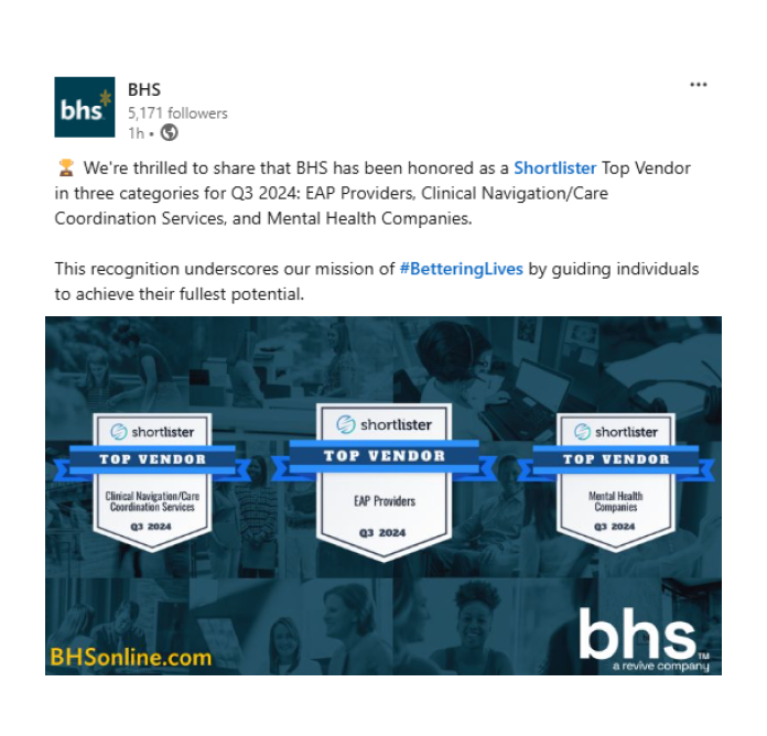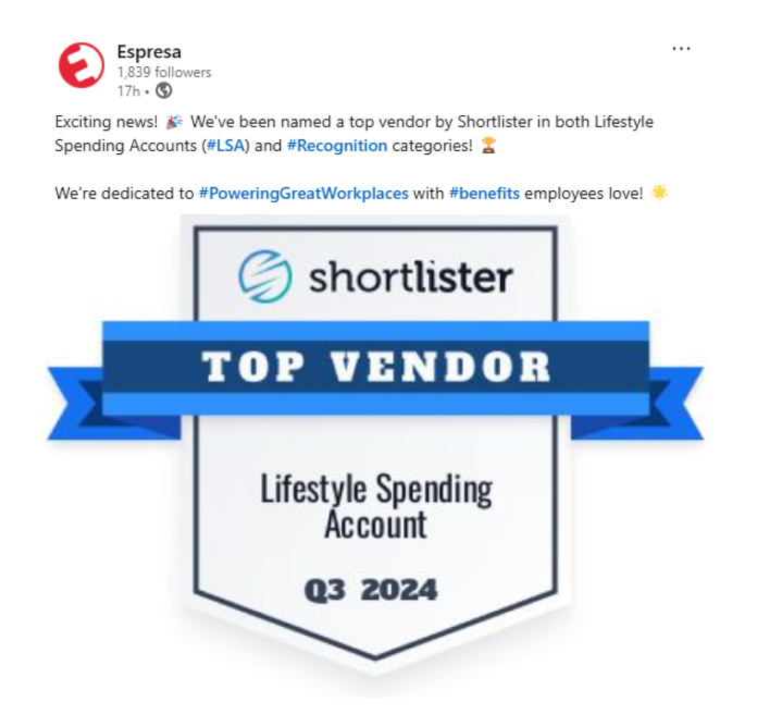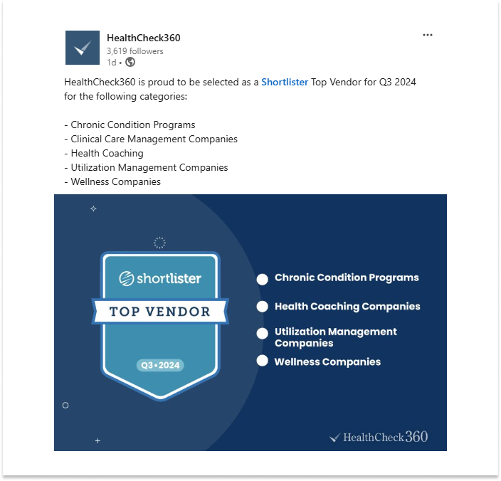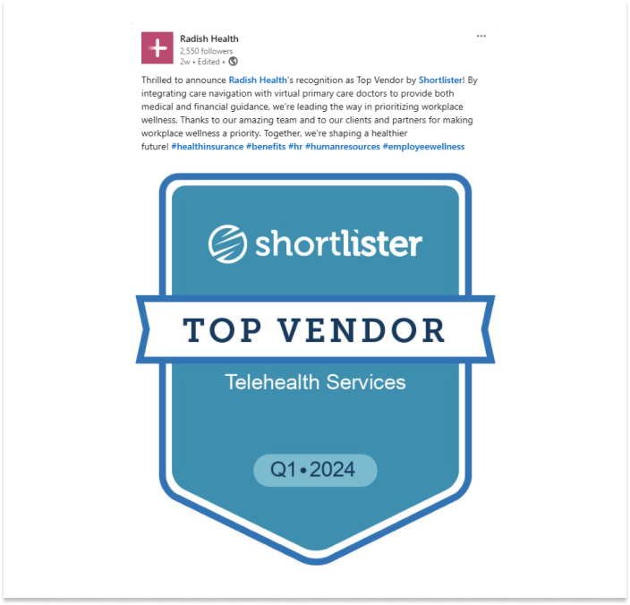 Shortlister’s Top Vendor Program recognizes and rewards high-performing vendor partners. Every quarter, we use objective criteria to select Top Vendors, showcasing this recognition to our extensive audience of employers and brokers.